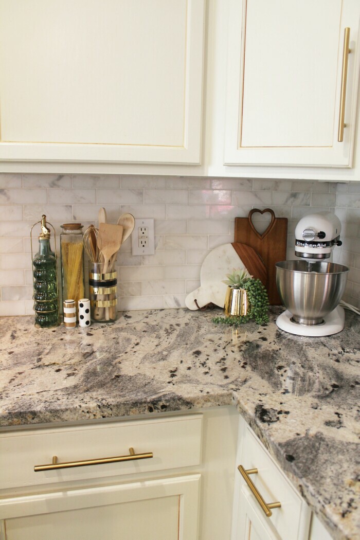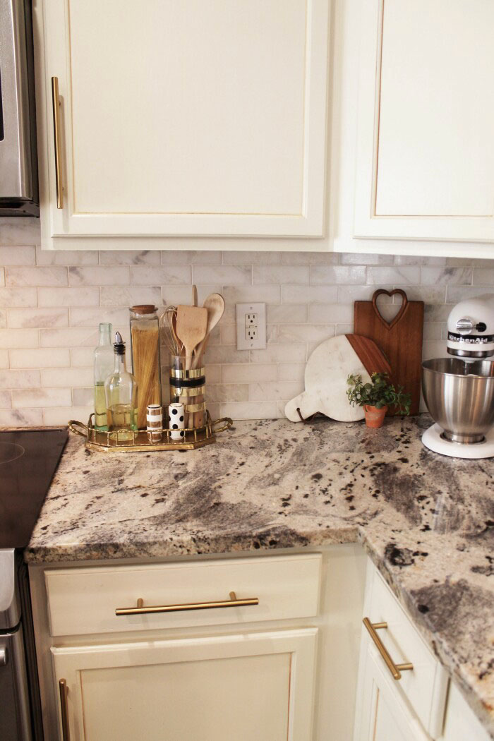 Love the new look too, the bottle set is super cool! Where did you find them! I do, however, like the look with the marble tray best. Kinda corrals them and defines the space a bit.