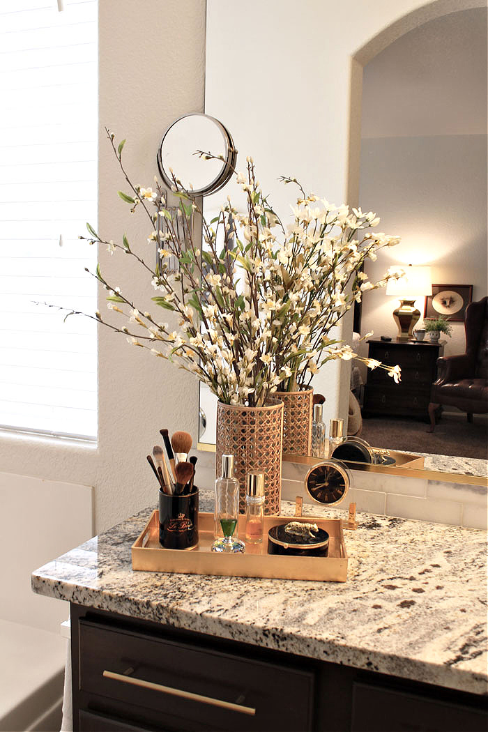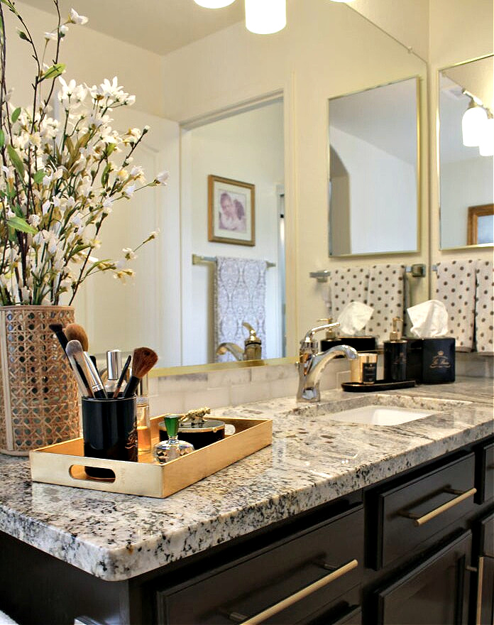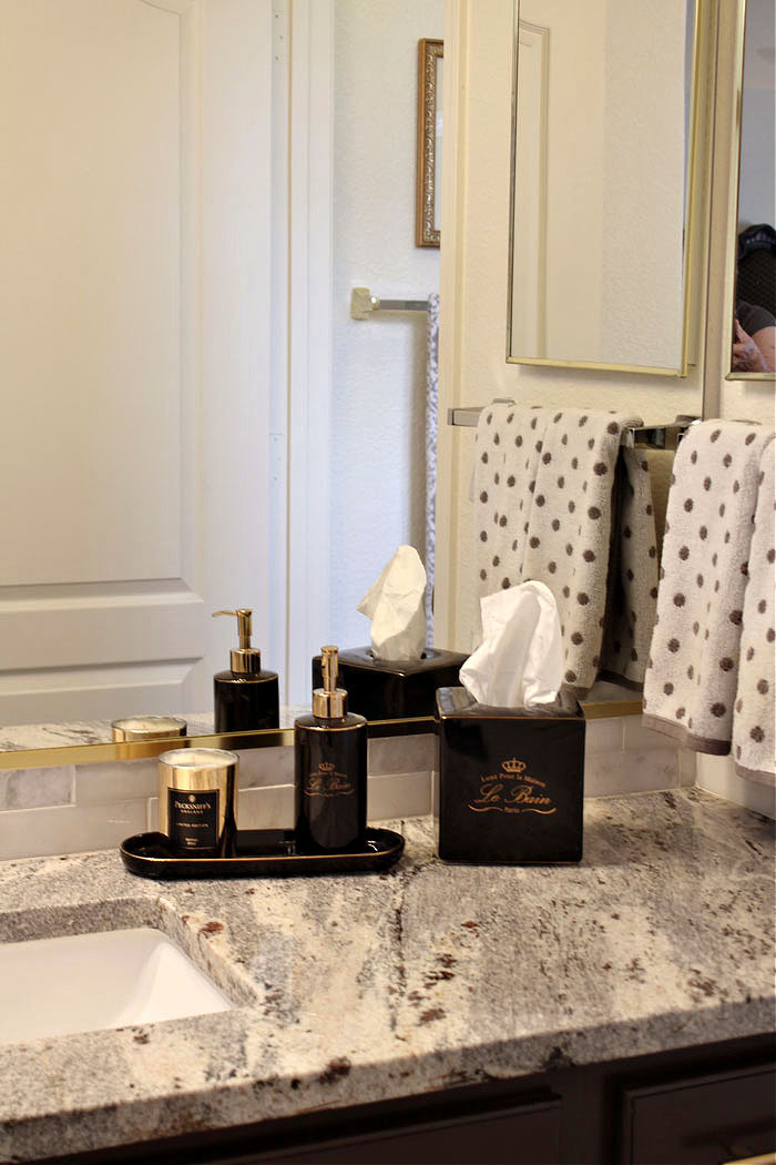 I grabbed a gold tray out of my stash and then shopped my closet for a few accessories that I’ve been using in my primping area—a small perfume bottle and a pretty black box with a leopard on top. I placed my makeup brushes in the black water glass, and I switched the crystal clock for a black and gold one.