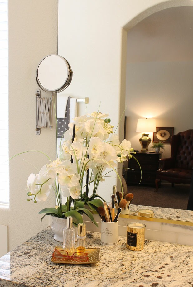 On this side of the vanity, I had a small tray with a couple of my favorite colognes, an orchid, makeup brushes, and a candle. Clutter free, and simple. I like that it doesn’t take up a ton of space.