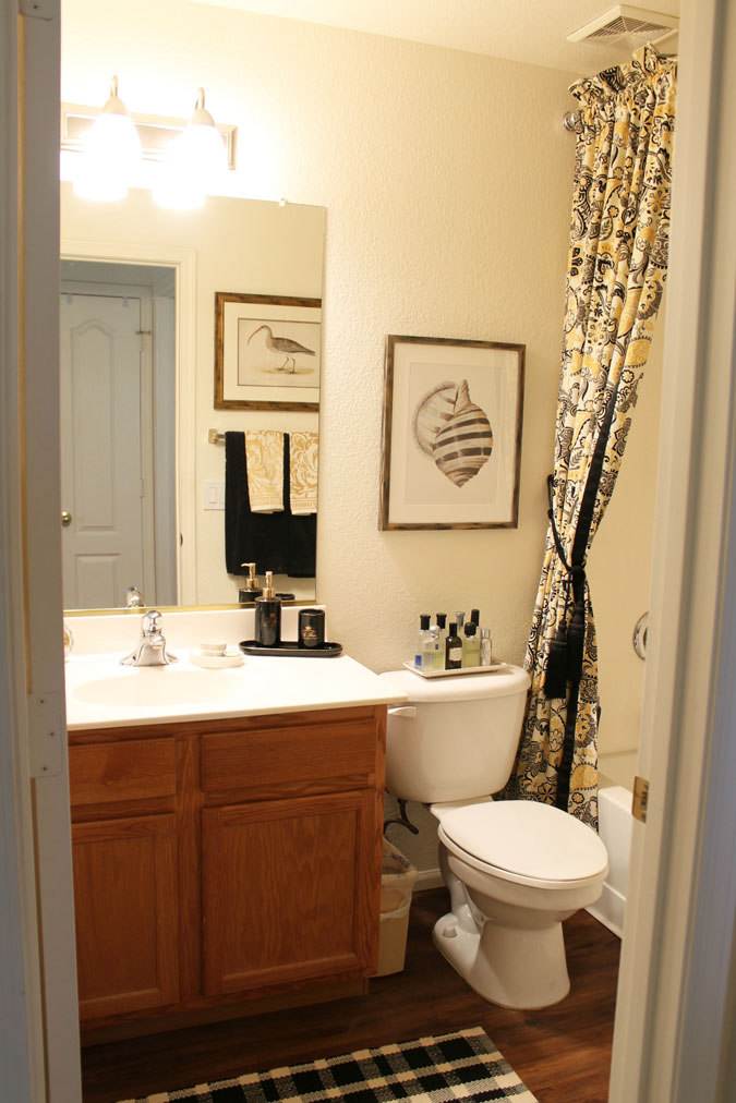 New vanity, toilet, medicine cabinet, and mirror. Add in some new accessories and this bathroom looks majorly different. The new vanity is so much nicer than the old builder-grade one. Hubby uses this as his bathroom, so he is going to love the extra drawers and storage in the new vanity.