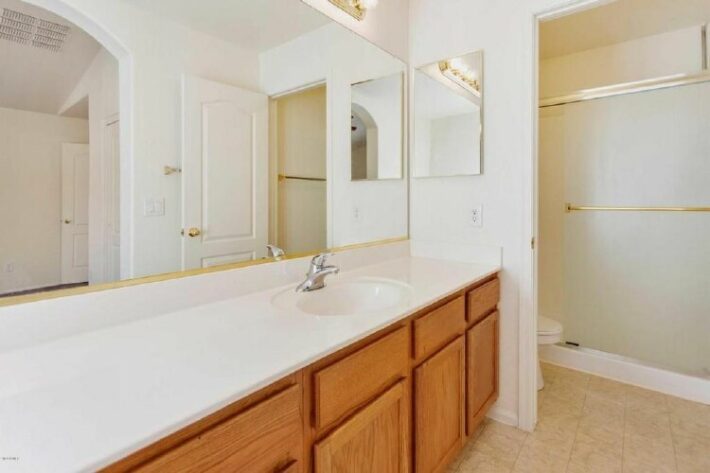 Things got put on the back-burner for a while. I had back surgery in June of 2018 and had doctors’ orders to sit on the sideline for a year. The year is up so – – – – June 2019 I finally stained the vanity and gave it some love. This is what it looked like when we moved in.